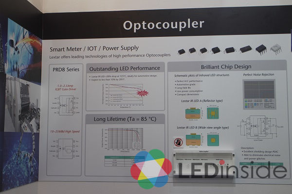 隆达同时亦展出最新款高阶光耦合器,结合该公司垂直整合优势,及自行设计LED晶粒与IC,具有寿命长、耐高温等特点,其寿命长达100万小时以上,且在摄氏125度高温作业下其产品性能较市面产品高出35%以上,达到车用等级的品质可靠度。