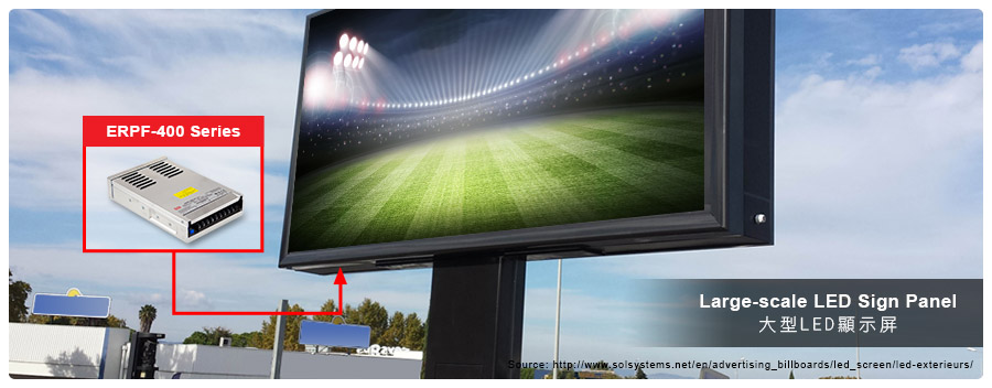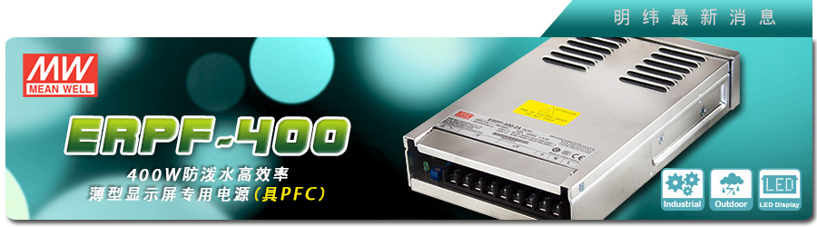 jinnianhui今年会薄型显示屏专用电源—ERP-350系列(350W),因其防泼水功能及高效率等特点,上市多年来已广为应用在户外大型LED显示屏及LED发光字体等商业照明场所,jinnianhui今年会为持续提供用户更佳的产品规格,新推出了内建主动式功率因子矫正(active PFC)功能的ERPF-400系列(400W)。